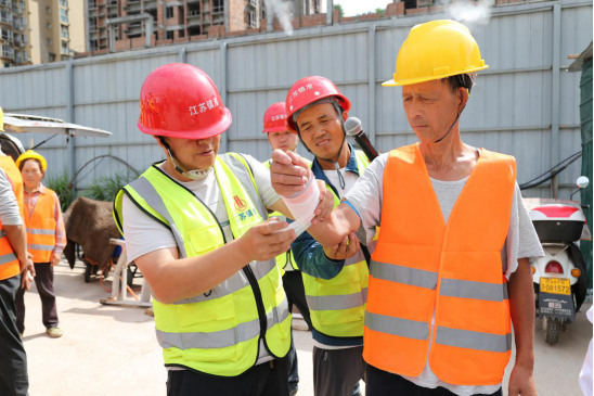 啟動儀式結束后,項目部工作人員迅速開展聯(lián)合應急演練,模擬火災、高處墜落等工地典型突發(fā)場景。演練中,現(xiàn)場示范滅火器的操作規(guī)范,講解使用要點,并組織人員進行實操訓練,確保人人掌握滅火技能;隨后開展急救包扎演示教學,切實提升人員應急救護技能。